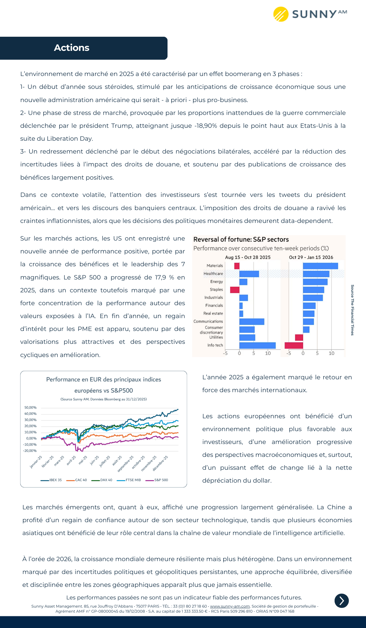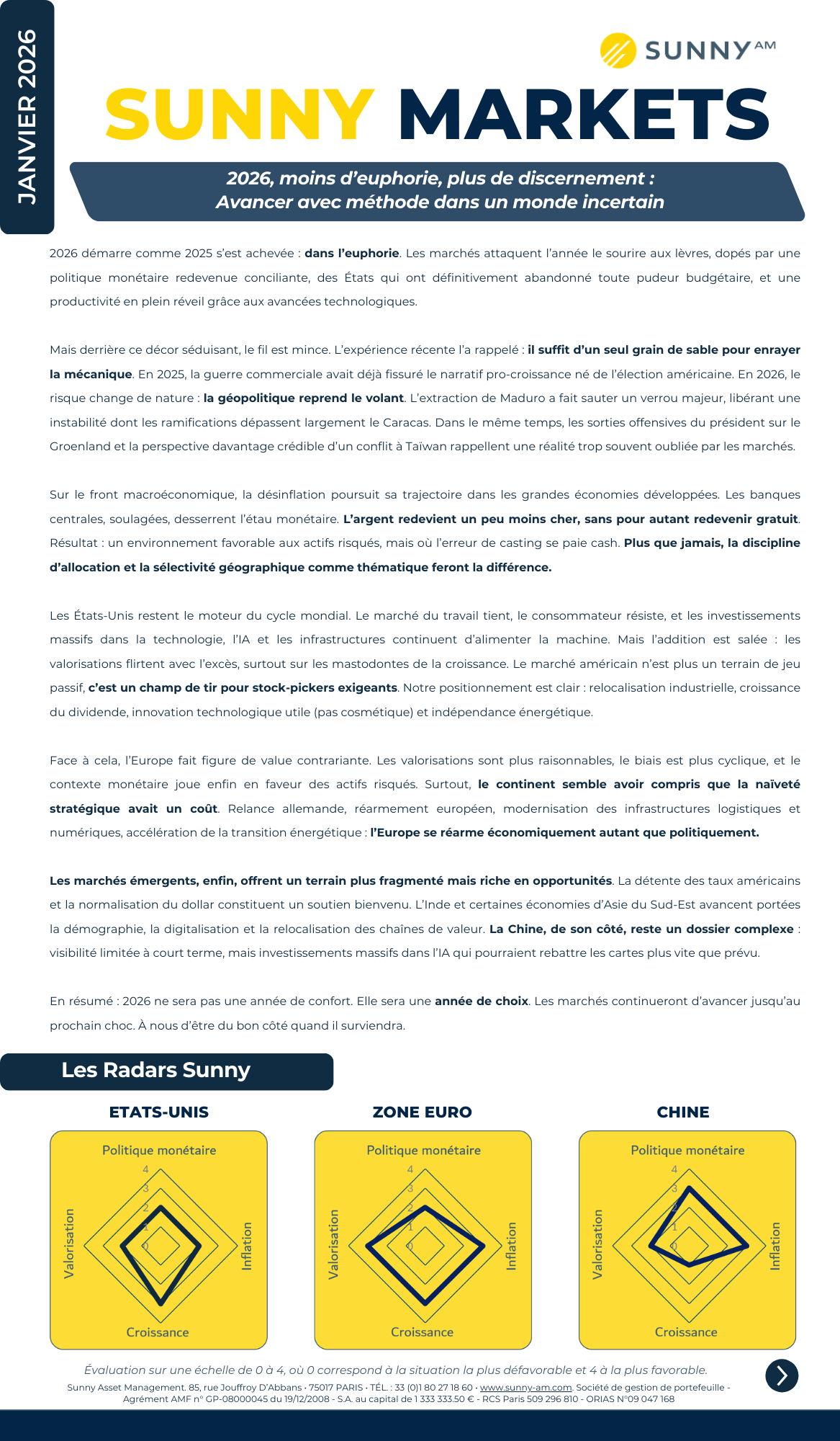 Les informations diffusées sur ce site internet ne comportent pas d’offre ou de recommandation d’achat ou de vente de valeurs mobilières. Les données mentionnées ont pour seul objectif d’informer le souscripteur ou le futur souscripteur en complétant certaines caractéristiques financières figurant dans le Document d’Information Clé (DIC) ou dans le prospectus de chacun des OPC présentés. De ce fait, ces informations peuvent être partielles et sont susceptibles d’évolution, Sunny AM décline toute responsabilité à l’égard de décisions d’investissement ou de désinvestissements qui seraient prises sur la base des données figurant sur ce site internet, sans consultation préalable de la documentation réglementaire (DIC, Prospectus, derniers états financiers disponibles).